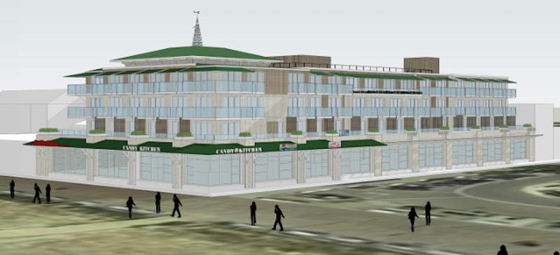 The hotel has an address of 2 Rehoboth Ave., but the project site stretches the width of the block south to Wilmington Avenue and also fronts the Boardwalk. The structure would be four stories, with the hotel occupying the top three and retail on the ground level. As before, the entrance to the hotel is on Wilmington Avenue, but another change is that the main lobby has been moved to the second floor.