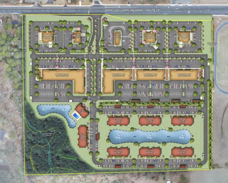 The plan includes three sections, including five commercial lots along Route 24, mixed commercial and residential units (similar to the Villages of Five Points), and seven garden-style apartment buildings for a total of 344 units.