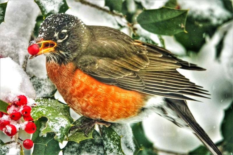 This robin enjoys a red berry snack during the recent snowstorm. Photo by Bea Hickey.