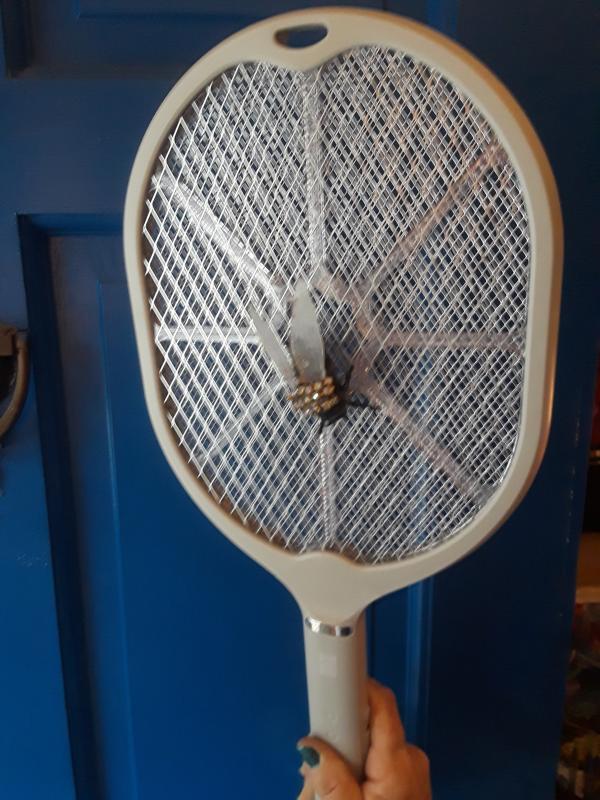 Finally, I just purchased a pair of so-called bug-killing rackets. They were Jeff's belated Father's Day gift so he hopefully won't have to wear out his bedroom slippers anymore. So far I haven't heard any big electrocution buzzes from waving them around, and I don't play pickleball, as you might have guessed. When turned on, they emit a science fiction-like blue light. I know they work because I zapped a carpenter ant on Jeff's chair today and saw a small flash of blue light as it met its demise.