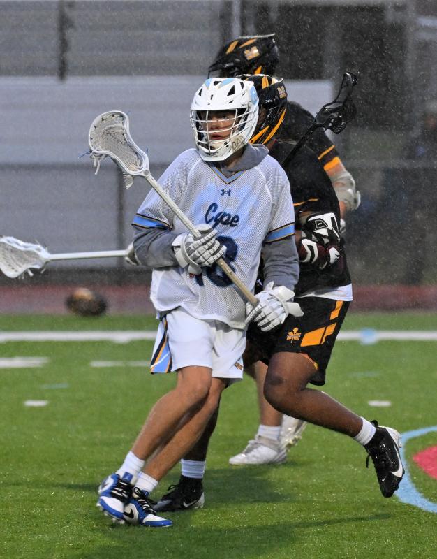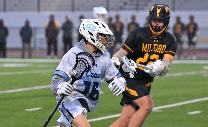 In rainy and windy weather more suited for a duck, the Cape boys’ lacrosse team made it seven straight wins with a 22-2 running-clock victory over Milford April 11 at Cape’s Legends Stadium.