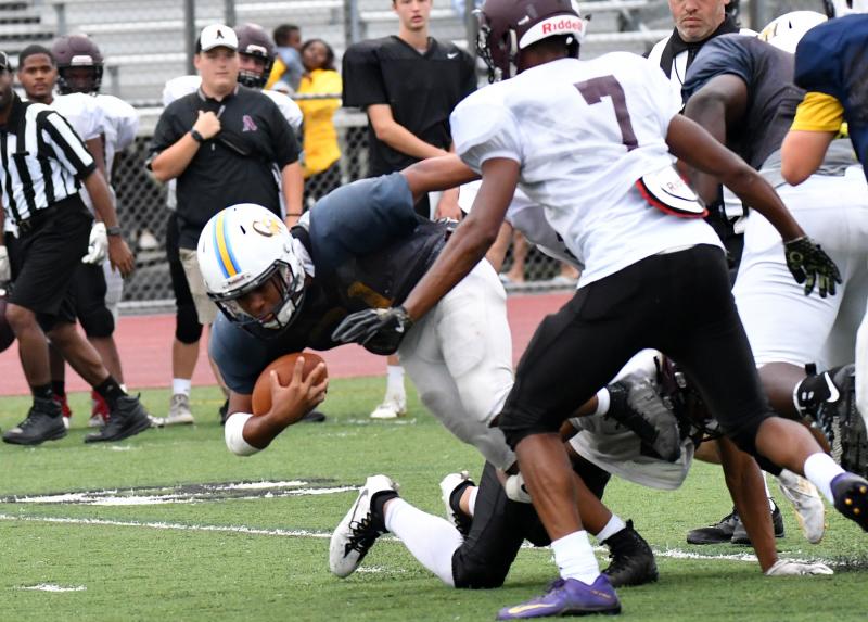 The Cape football squad fought off torrential downpours and flooded highways Aug. 23 to travel to Appoquinimink to participate in a three-team scrimmage with the Appo Jags and Howard High School of Technology.