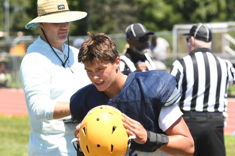 Coach Mike Frederick reflected on the scrimmage a day later after reviewing the film. “We had issues with missed assignments and penalties on offense that need to be cleaned up,” he said. “Not unexpected for one practice in pads, but more than I had hoped for. Hodgson showed a handful of blitzes that we will be more prepared for by the start of the season. We didn’t game plan to win the scrimmage. Our focus was on self-development and identifying player depth.”