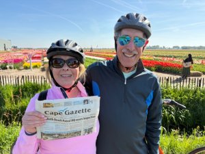 Debbie Director and her husband, Rob, traveled from Amsterdam to Brussels, exploring the Netherlands during peak tulip season. Two highlights of their journey included cycling through the famous Keukenhof Gardens and the peaceful lowlands of Kinderdijk. The photo captures their ride near Keukenhof, where rented bikes offer a scenic way to enjoy the vibrant flower fields and Dutch countryside.