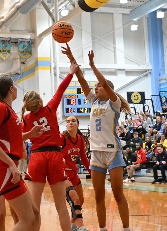 Cape opened the game with the first two baskets, but Ursuline responded, and the Vikings trailed 11-6 at the end of the first quarter. The Raiders extended their lead in the second quarter, sending Cape into halftime down 28-14.