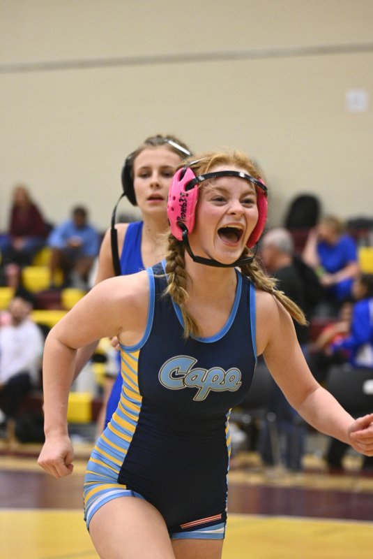 Cape entered the Milford Invitational with a practice roster of eight athletes, six of whom competed. The team filled five of the tournament’s 12 weight classes, including two competitors at 185 pounds. The Cape ladies were represented by freshman Mackenzie Mears (120 pounds), freshman Leighton Meck (132 pounds), freshman Delaney Gallagher (138 pounds), senior Kiersten Smith (185 pounds), freshman Kylie Payton (185 pounds) and freshman Helaina Arnold-Decyk (235 pounds).