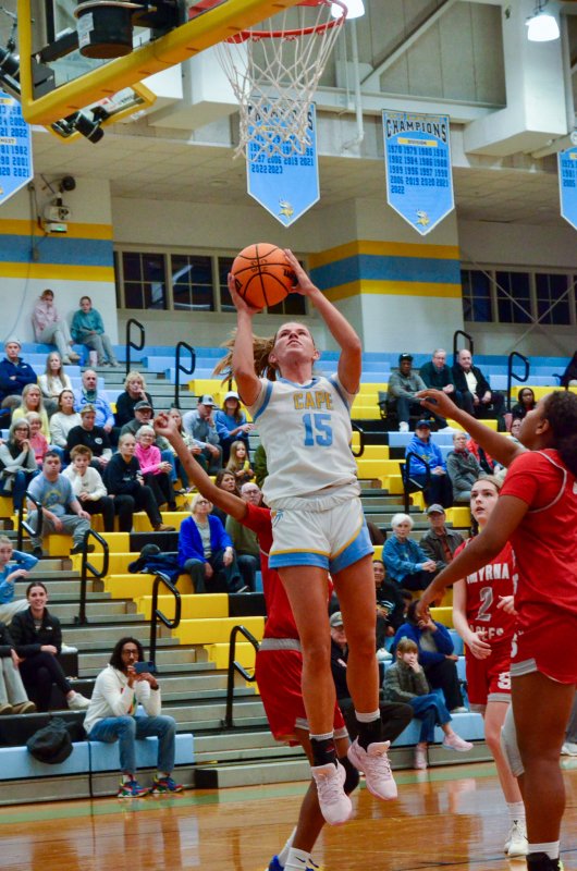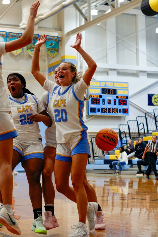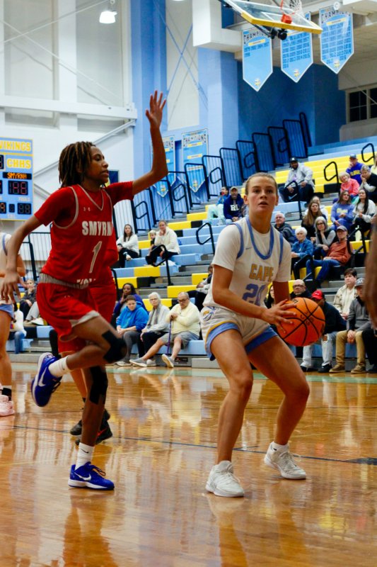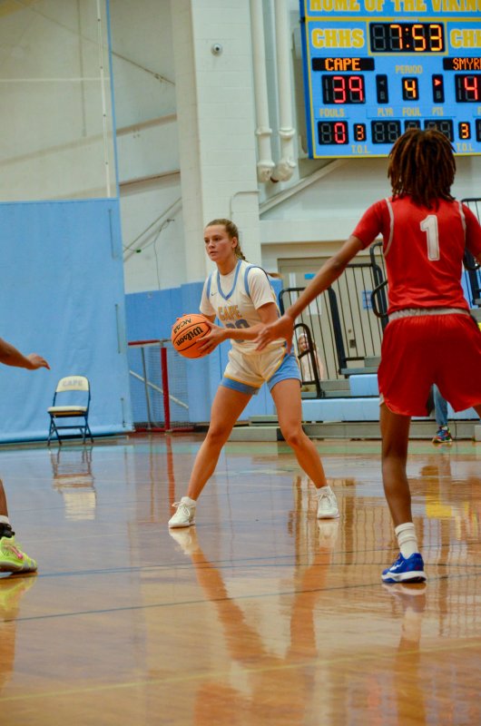Sophomore Jordan Bowe ended the third by hitting two free throws and opened the fourth with another pair of free points to keep the Vikings within striking distance. Classmate Mikaela Gordon connected from deep to tie the game 50-50. Smyrna regained the lead before Fruchtman knocked down a three to give Cape a lead it would not rescind.