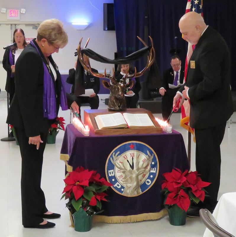 Exalted Ruler Joy Schreck opened the ceremony with a brief statement, followed by a prayer from acting chaplain and Past Exalted Ruler Ralph Patterson. Lodge Secretary Joanne Mayer, PER, solemnly read the names of each of the 19 departed members while Patterson and trustee Kelly Barber lit the ceremonial candles representing each of the missing members. Then, Past Exalted Ruler Gary Eckenrode recited the poem, “The Vacant Chair.”
