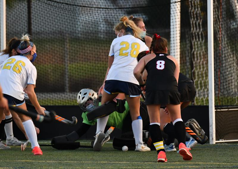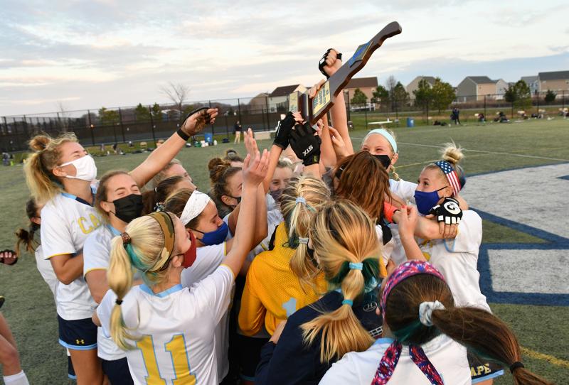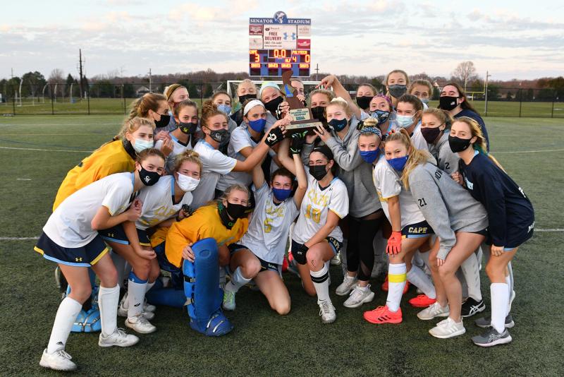The Cape Henlopen High School field hockey team celebrates the Division I state championship win. Shown in back are (l-r) Morgan Newcomb, Lulu Rishko, Casey Schnupp, Maren Buckaloo, Lindsey D’Ambrogi, Ella Rishko, Molly Mendes, Emma Duffield, Sierra Manifold, Mackinzie Brown, Lexi Truitt, Lily Ashby, Samantha Connors, Sommer Dorman, Carrie Clausius, Anna Lopez, Grace Wiggins and Hannah Maney. In front are Kelly Bragg, Julie Heffernan, Haley Craig, Reagan Ciabattoni, Riley Klopp, Emily Monigle, Riley Keen, Maggie Dawson, Noelle Sabbagh and Lexi Nowakowski. DAN COOK PHOTOS