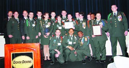 Shown at the awards in back are (l-r) Cape Henlopen High School Principal John Yore, Garret Short, Gov. Jack Markell, Kevin Taylor, Tyler Bradley, Eric Littlefield, Chris Hardy, Cadet Command Sgt. Major Ashley Robinson, (middle) James Pavese, Brittany Harmon, Olivia Henning, Abby Simonson, Felicia Darlington, Cadet Capt. Aleshia Boyer, Cadet Major Krista Hearne, and Cadet Lt. Col. James Darlington. In front are Thomas Kashner, Kurtia Maker and Cadet Major Jeremy Ricketts.