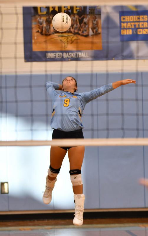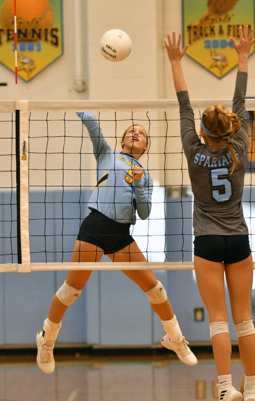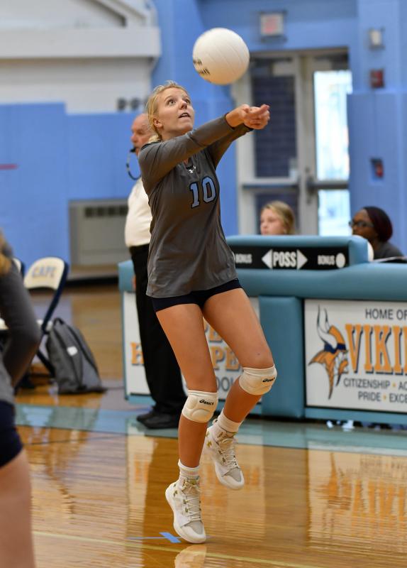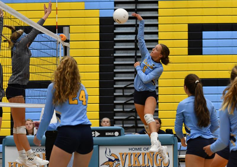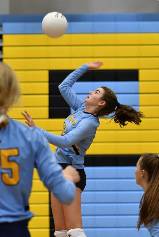 Emily Lamb and Jocelyn Leach teamed to slam 11 aces in the match. Setter Abby Derrickson assisted on seven points and got five digs. Angelica Kusen, Katie Knarr and Rileigh Wilson put down four kills each. Bre Kusen had five blocks.