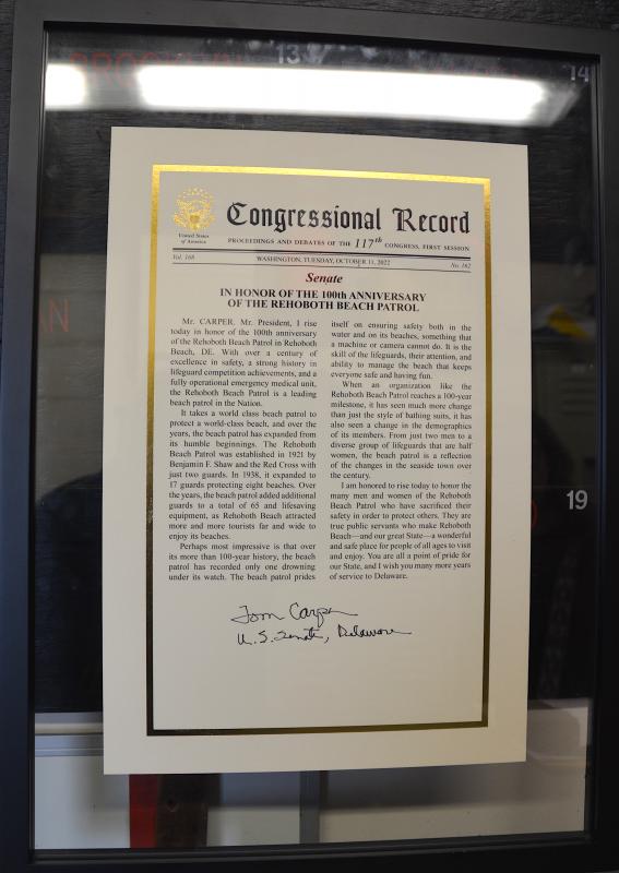 Rehoboth Beach Patrol continued celebrating its 100-year anniversary Oct. 17, when U.S. Sen. Tom Carper presented a Congressional Record Statement honoring its century of service.
