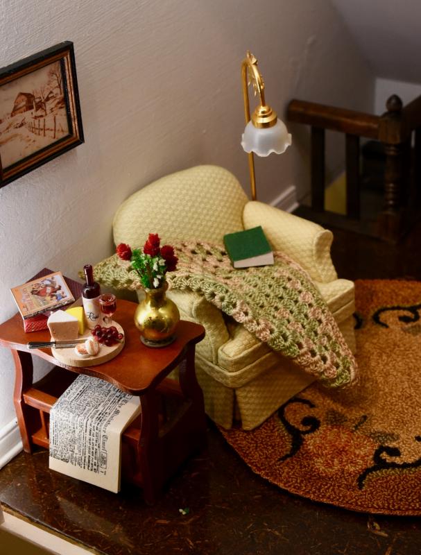 Walt keeps the trains running, and uses his experience as a builder and electrician to construct the houses. Cathy does most of the finishing work – she hand made 1,100 cedar shingles for the Victorian house – and Liz and Cathy are the interior designers. Liz also makes jewelry and is able to use her talent to find and repurpose accessory pieces. They are experienced shoppers, finding miniatures at local shops or online.