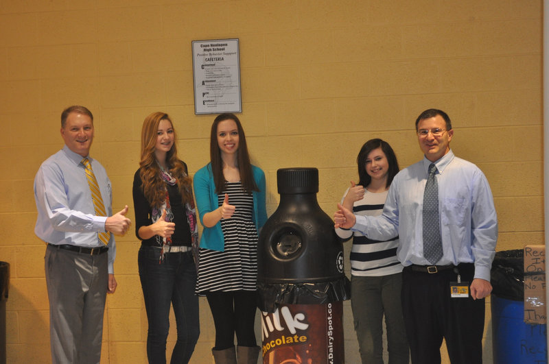 The Green Club at Cape Henlopen High School continues its recycling effort by collecting recyclable goods throughout the school week. Pictured are (l-r) Assistant Principal Michael Young, President Jessica Stevenson, Vice President Emily Reed, Treasurer Rachael Sthrom and Advisor Matthew Kasmer.