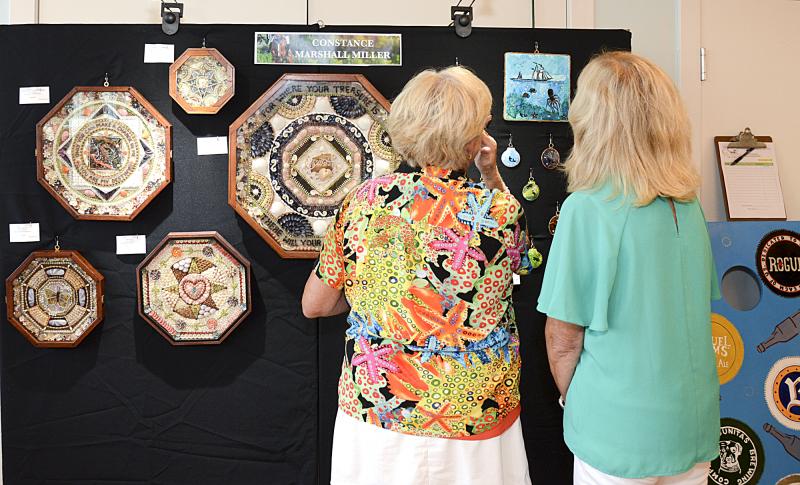 Sporting a classy fascinator is Lexi Ellis and Bill Ellis dons a Panama hat as they peruse the art exhibition.