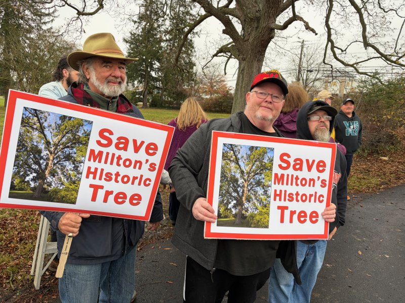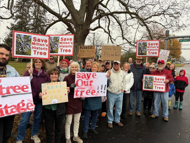 Despite gray, wet conditions, about 25 people gathered in Milton Nov. 22 in an effort to save a historic pecan tree at the corner of Route 16 and Union Street Extended that is slated to be felled for a new Royal Farms at the site.