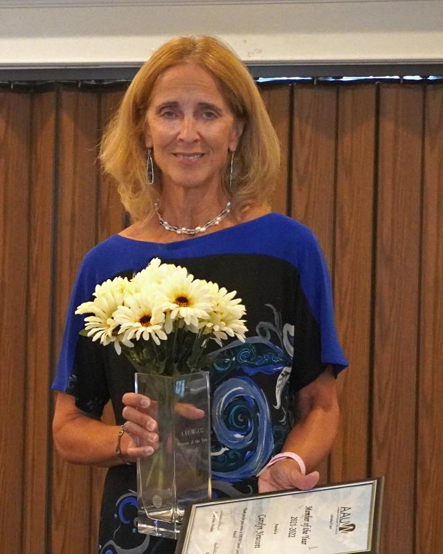 Carolyn Newcott, branch communications director, was named Member of the Year for her outstanding dedication to AAUW’s mission of reaching gender equality in education, economic security and leadership. Barb Shamp, scholarship chair and board member, said during her two terms as communications director, Newcott’s technical leadership, particularly during the COVID-19 pandemic, was invaluable. Last year, Newcott piloted the program to put the branch’s scholarship application online. Especially in emergencies, Shamp said, Newcott approached each challenge with a spirit of competence and serenity. For her service, Newcott was presented with an engraved vase of daisies, symbolic of the Member of the Year honor’s traditional name, The Daisy Award.