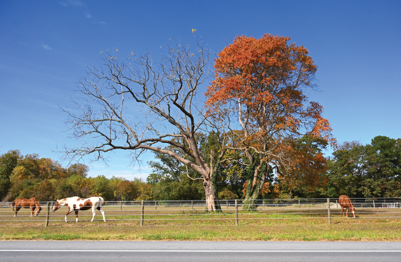 These horses enjoy an unusually warm October afternoon under the bright-orange leaves of a tree in a field on Cave Neck Road near Milton.