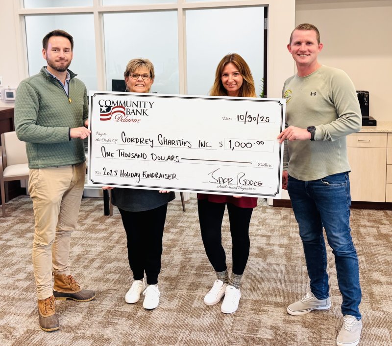 Community Bank Delaware receently presented a $1,000 donation to Cordrey Charities in support of its 2025 holiday fundraiser, to be held Friday, Dec. 5, at the East Coast Garden Center near Millsboro. Proceeds will directly benefit local families in need.