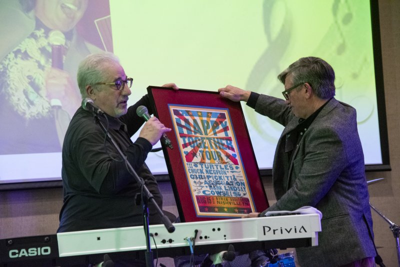 Alan Tilles talks about the history of a tour poster up for auction as Richard Bryan prepares to get a good donation for the gift.