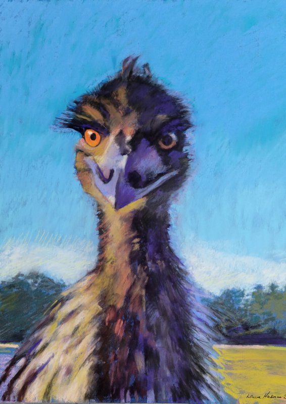 In “I've Got My Eye on You,” Laura Hickman depicts her neighbor’s emu, who likes to greet people and dogs as they walk by. “His large and intense, piercing eyes seem to be seeing and knowing everything,” she said.