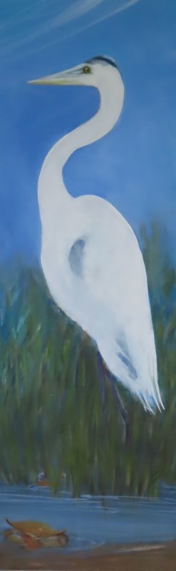 The heron is a shared favorite for Cheryl Wisbrock and Lesley McCaskill. In her “Hunter and Hunted” painting, Wisbrock said she was thinking of the old creature feature horror movies and cast the heron as the villain. “Herons and crabs aren't friends, and in fact one preys on the other, but both are favorite sights in our natural settings. I think of horror movies when I think of the theme title, and I think one creature hunting the other (or hiding from a predator, like the smaller crab is doing) is a little frightful.”