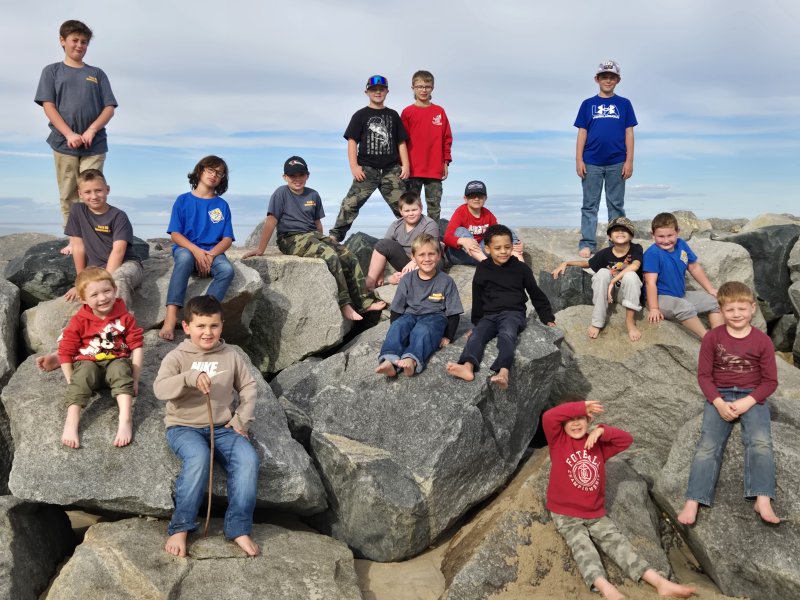 After lunch, the Bears practiced their whittling skills on bars of soap while other scouts enjoyed free play time. Next came the hike to the beach for some recreation time with Frisbees and soccer balls. It was still a beautiful day, and everyone had a great time. They even found a moon jellyfish. Leaders gathered all the scouts for a group picture on the jetty rocks before heading back to camp.
