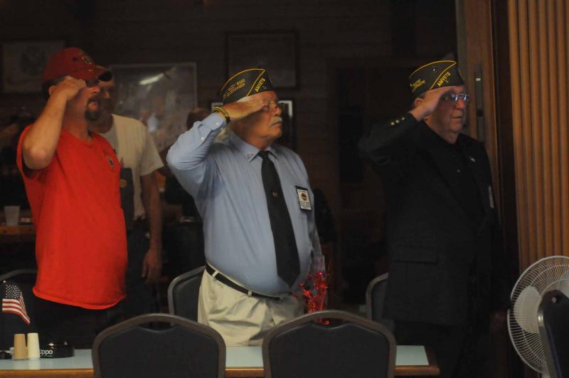 During the Pledge of Allegiance, (l-r) Steven Lee, 2nd Vice Commander William Biggs and Trustee Ed Larrimore salute the flag. BY STEVEN BILLUPS