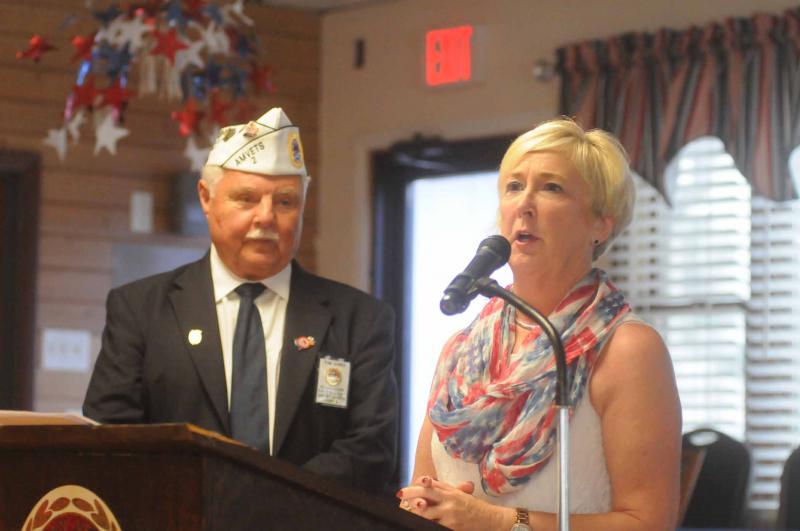 Rep. Ruth Briggs King, R-Georgetown spoke to the gathered veterans and their families. She told of her family that has served in the military from the Revolutionary War and in each war up to the Viet Nam war. Shown with Briggs King is AMVETS Commander Tom Jones. Jones remarked that Briggs King is a friend of the veterans. BY STEVEN BILLUPS