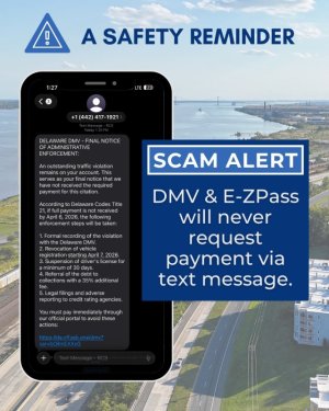The DMV urges all residents and customers not to click on any links that solicit money for unpaid traffic or toll violations, or for account replenishment. The Delaware DMV and E-ZPass Delaware will not contact individuals via text demanding payment for a violation.