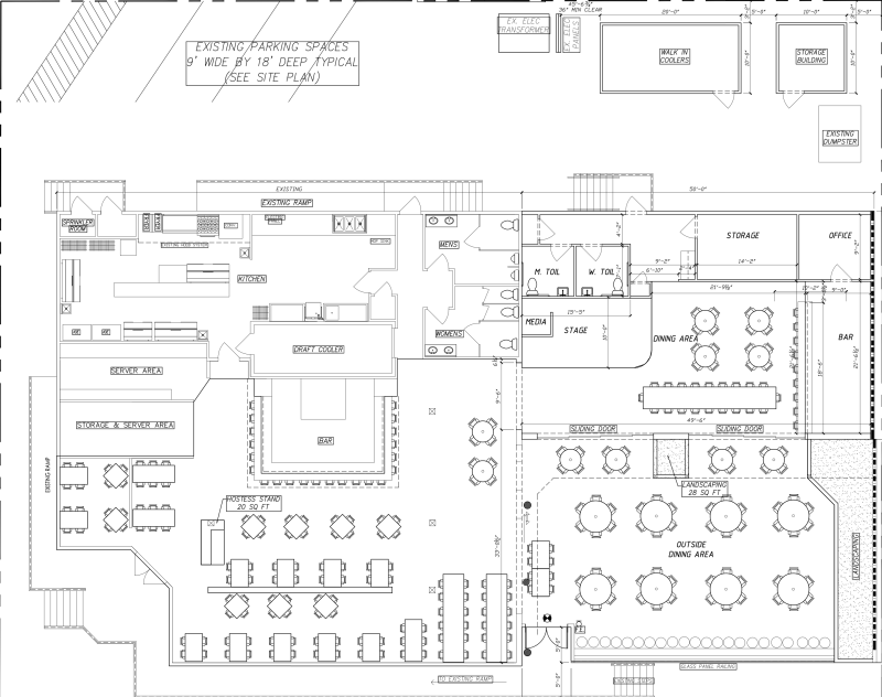 The proposed expansion would enclose a portion of the graveled outdoor area located behind the patio. The stage, currently located adjacent to the indoor bar, would be relocated to the new indoor dining area.