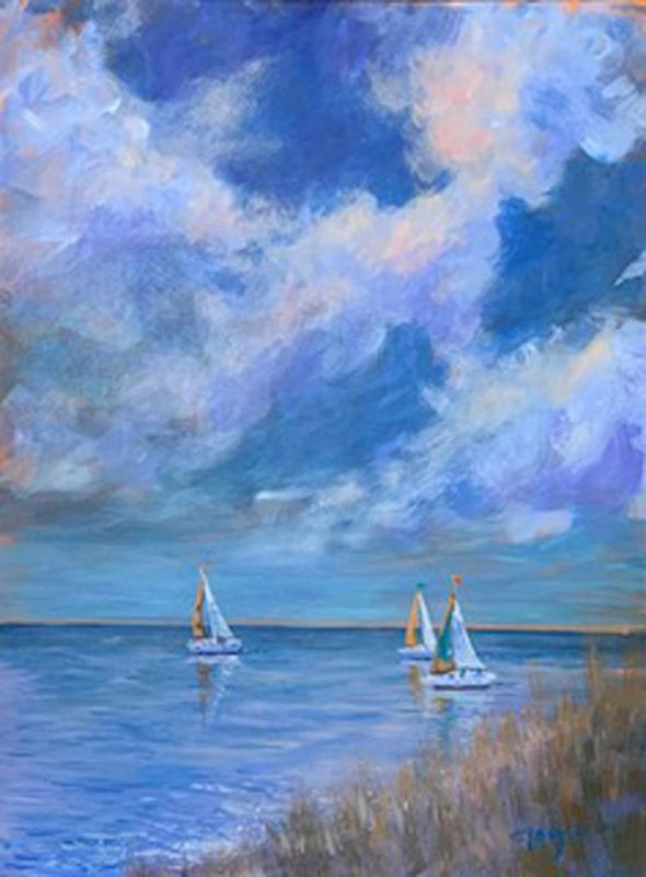 In an effect called Rayleigh scattering, sky, sea and waterways appear bluer when sunlight passes through the atmosphere and the blue wavelengths are dispersed more widely by the oxygen and nitrogen molecules. This effect is beautifully illustrated in the skies of artists Laura Hickman, Dale Sheldon and Cindy Beyer’s featured paintings. In Hickman’s pastel, “Pomodoro in Winter,” January skies are a brilliant blue, reflecting the crystal-clear light in Bethany Beach during the long winter months. Sheldon’s sky in “Blue Skies and Blue Kayaks” reverberates with the blues of the kayaks and the reflected blue sand shadows bouncing off the lapis sky. Beyer’s "Blue Sailing" is dominated by a majestic blue sky reflecting the bay on a pristine summer day.