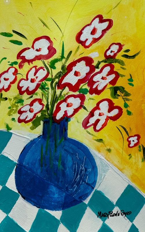 Mary Bode Byrd’s “Imitating Matisse” features a blue vase that recedes into the background, allowing the vibrant and whimsical flowers to dominate the foreground.