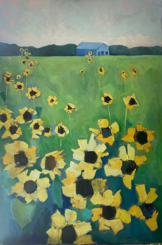 Through the effect of atmospheric perspective, the farther away an object is, the bluer it often appears to the eye. In Marybeth Paterson’s “Blue Barn,” a sea of sunflowers in blue’s warm complement, golden yellow, lead the eye into the distance to see the vibrantly colored structure.