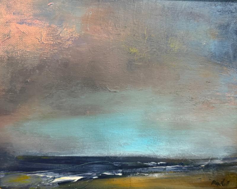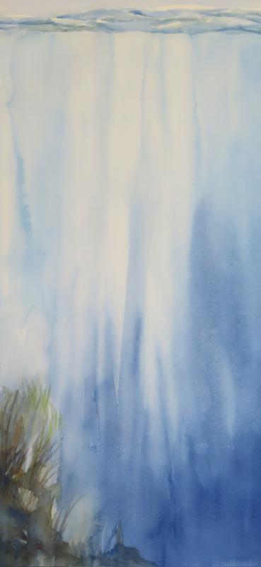 The color of the sea is also affected by the color of the sky, reflected by particles in the water. That luminous sea is discovered and explored in the paintings of Michelle Marshall, Ed Lewandowski and Cheryl Wisbrock. Looking at Lewandowski’s “Blue Grotto,” Marshall’s “Blue Sea,” and Wisbrock’s “The Deep,” viewers can revel in the array of varying blue hues.