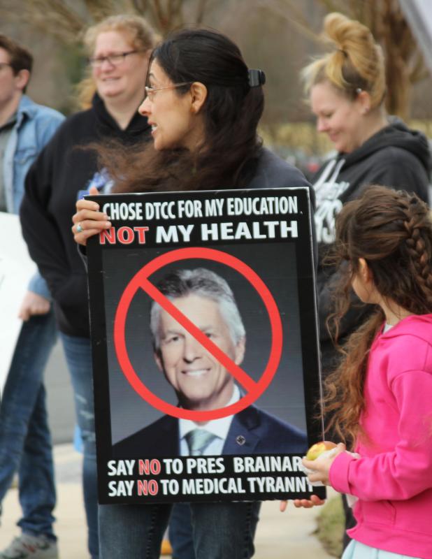 A group of protestors stood holding signs Feb. 23 opposing Delaware Technical Community College’s vaccine mandate and hoping President Mark Brainard would get the message.