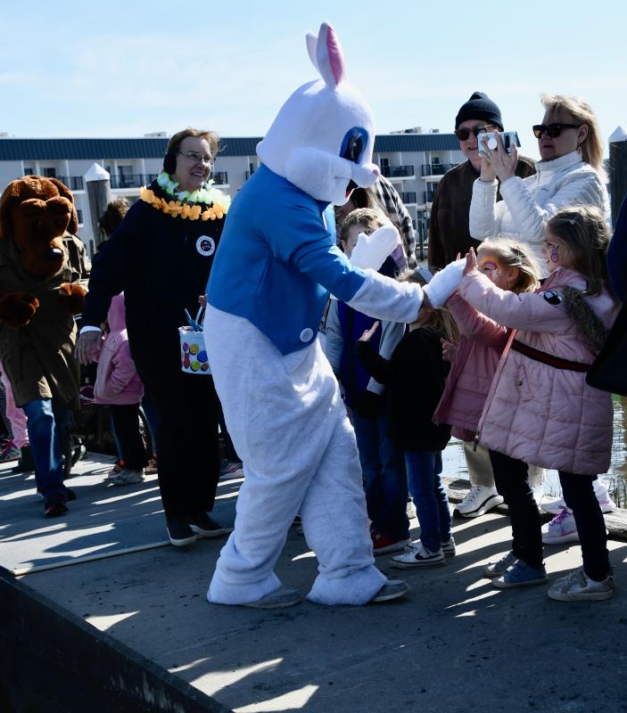 The Easter Bunny does a lot of high-fives as he makes his way down the dock after leaving his escort boat.