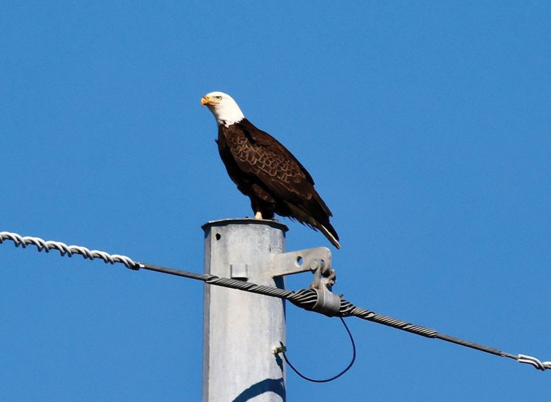 Perched atop a utility pole, a bald eagle keeps watch along Coastal Highway across from the old Coast Guard lifesaving station.