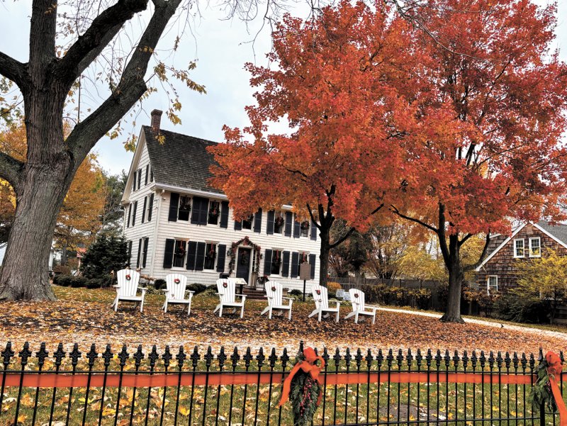 Burnt-orange maple leaves tower over the Hiram Rodney Burton House, adorned with yuletide greenery at the Historic Lewes campus.
