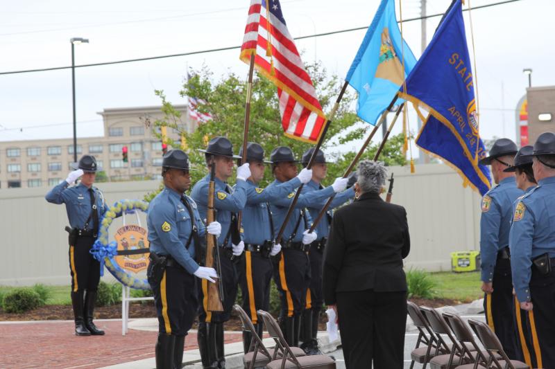 The Delaware State Police and Fraternal Order of Police honored fallen officers during ceremonies May 1 at Delaware State Police headquarters and Legislative Mall in Dover. At headquarters, the Delaware State Police color guard presents the colors at the beginning of the wreath-laying service. MELISSA STEELE PHOTO