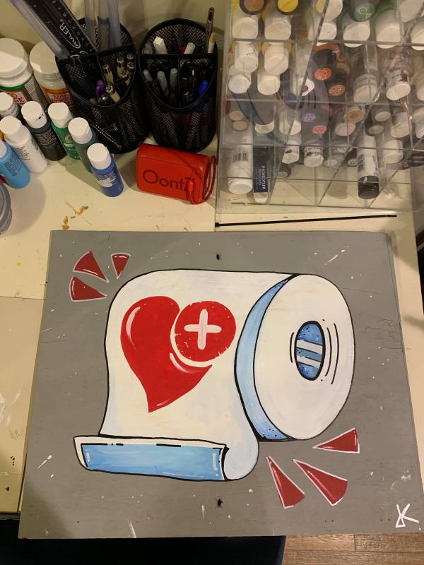 The first signs depicted toilet paper rolls with hearts and the word “Hope.”