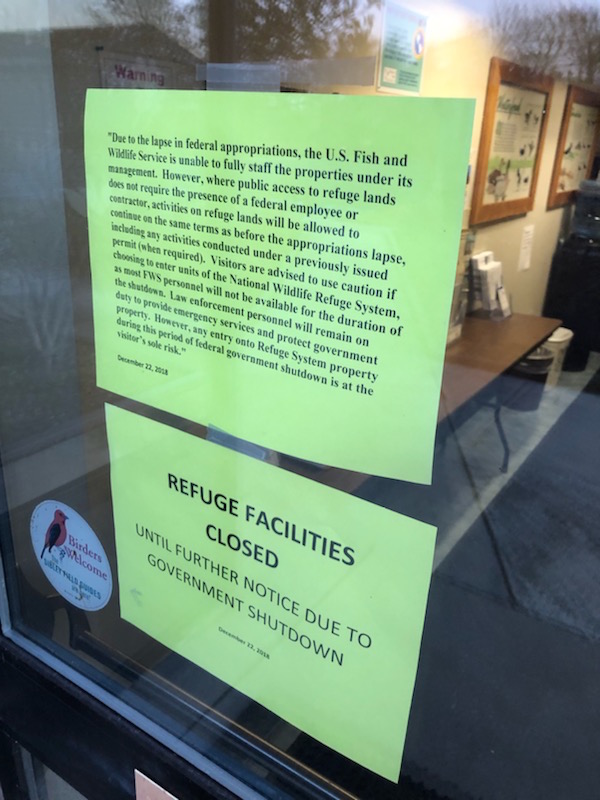 The presence of a federal employee or contractor is not required for the public to access refuge lands, the sign reads, so activities on the refuge may continue on the same terms as before the shutdown. Activities based on a previously issued permit, such as hunting, will continue.