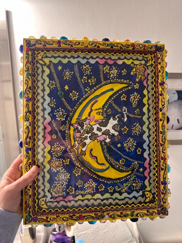 However, when they were growing up, the twins had been quite a handful! I painted a mural of a cow jumping over the moon on the dark-blue wall of their bedroom. It was a cosmic-themed room with stars and planets everywhere. The carpet was an impractical shade of man-in-the-moon Swiss cheese yellow, which was later spotted up with sneaker prints, so it looked the part.