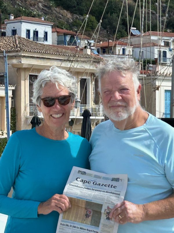 Diane Barlow and Marty Rosensweig spent five days sailing on a catamaran around the Saronic Islands of Greece after a few days in Athens. Stops included Spetses, Hydra and Poros, some of the most picturesque islands in the Saronic Gulf. With the stunning Greek scenery as their backdrop, it was the perfect place to catch up on Gazette news between island stops.