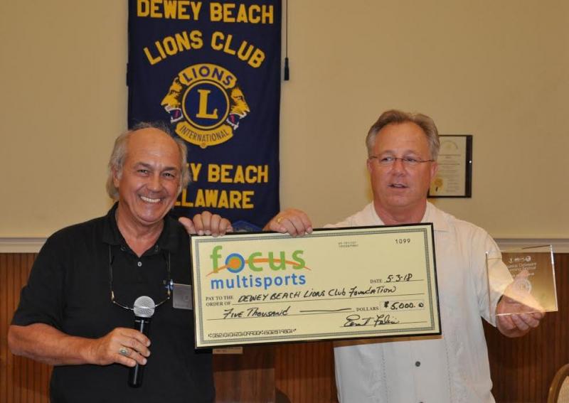 Focus Multisports Race Directors Ernie Felici and Rick Hundley presented $5,000 to the Dewey Beach Lions Club Foundation May 3 in recognition of their support of the Coastal Delaware Running Festival 5K held April 21. The Dewey Beach Lions Club provided the pre- and post-race venue featuring bottomless Bloody Marys donated by The Starboard.