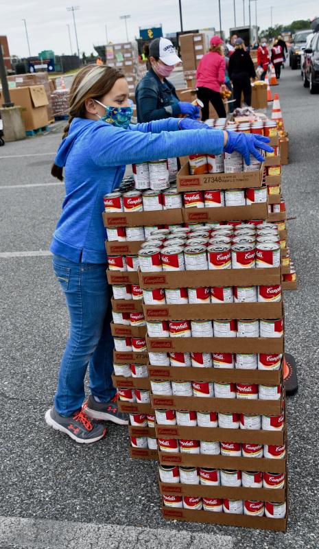 More than 150 volunteers helped the Food Bank of Delaware distribute nearly 79,000 pounds of food to 1,491 families during a mass distribution May 18 at Sussex Central High School. The Food Bank has scheduled several mass distributions throughout the state to meet growing demands for food due to financial strains on families caused by COVID-19 restrictions.