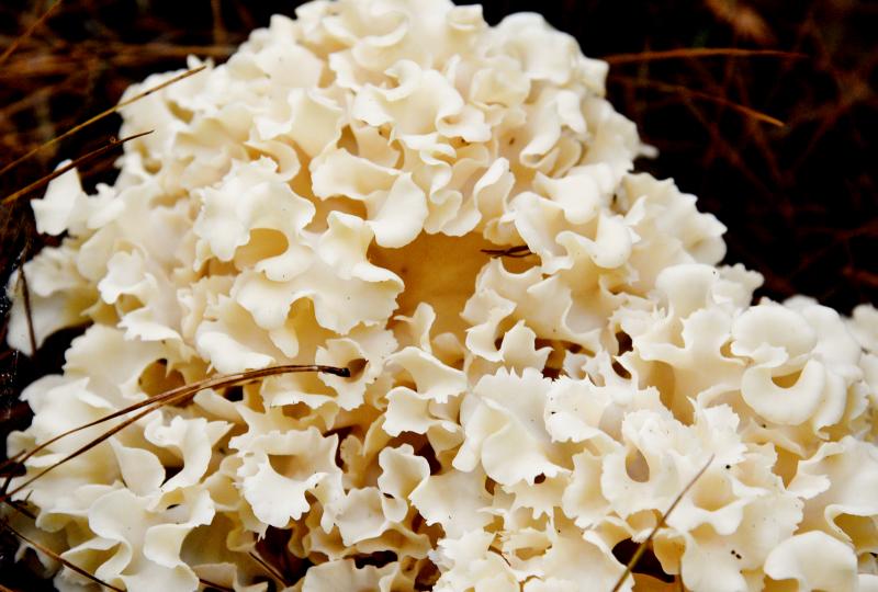 Cutting a large circle through the woods and down a horse path, Saunders discovered reishi mushrooms were abundant. She also found several varieties of boletes and a surprise. While heading out of the forest, Diana quickly turned left and made a beeline for what looked like a plastic bag out of place. She instantly knew what it was, and got a grin on her face. It was a rare parasitic fungus, the cauliflower mushroom. The head looked like a large cauliflower, thus the name, but the leaves are reminiscent of egg noodles and can be used that way.