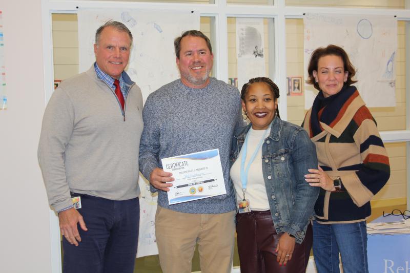 School board member Jessica Tyndall read Bill Funkhouser’s nomination for the monthly award, noting his contributions to the school community and remarkable ability to engage students in movement activities, fostering a love for physical fitness that keeps them excited and ready to learn.