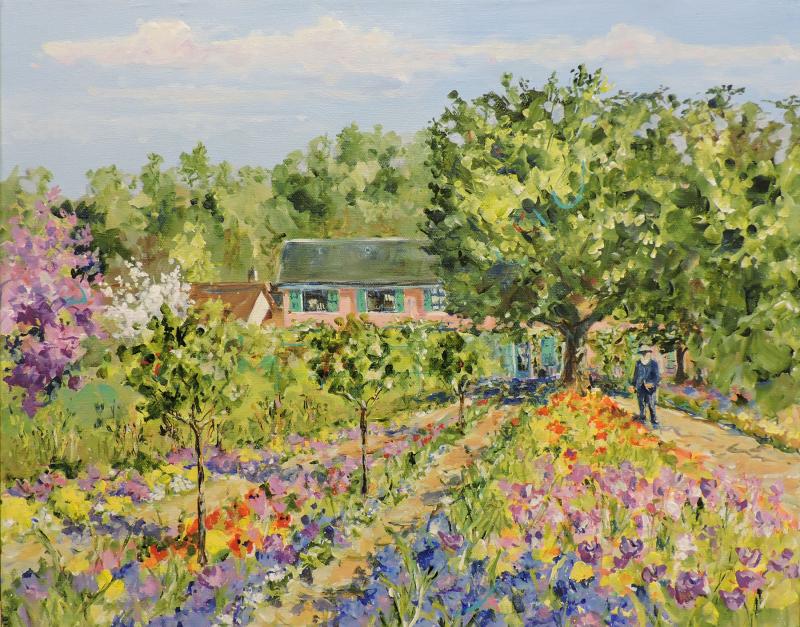 Many of the artists found themselves this month in a springlike reverie of fantasizing on canvas about nature in its warmer, more verdant version. The gallery is alive with birds, gardens, flowers and fish. Dale Sheldon’s acrylic painting “Meeting Monet” combines a wish to meet the legendary painter himself with a depiction of his lush garden in Giverny, while Cheryl Wisbrock’s watercolor painting “Nature Preserve” is a more local illustration of a small park reminiscent of a fairy garden in vibrant shades of green.