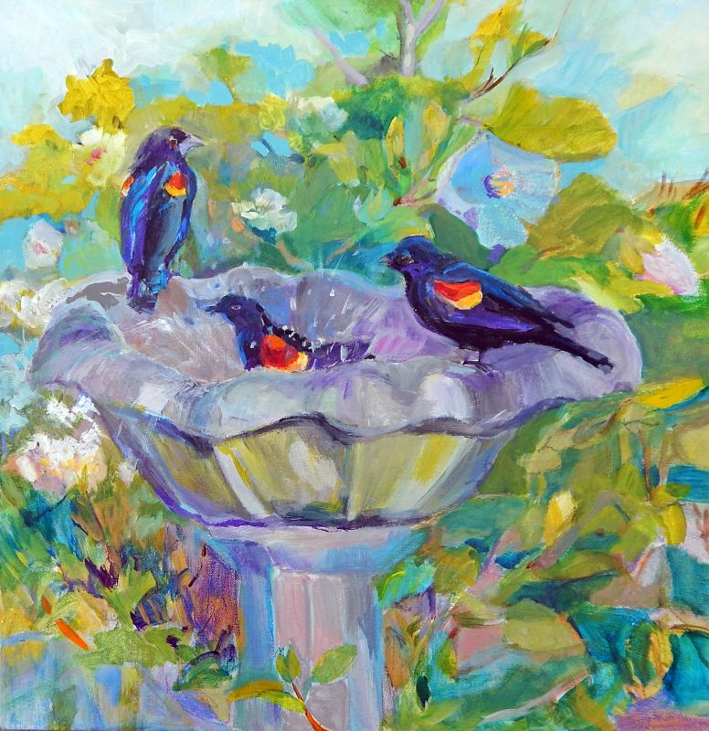 Artist Leo Kahl found himself wondering what happens at night in gardens, away from nature lovers’ prying eyes in his painting, “They Only Come in the Night.” Lesley McCaskill relives a fantasy day with the birds in her backyard in her acrylic painting “Reverie.” And in her oil painting “Overture,” Eileen Olson has created a dramatic amalgamation of all her bird fantasies. Her depiction of glowing red wings passionately exploding against a deep blue sky takes one’s breath away.